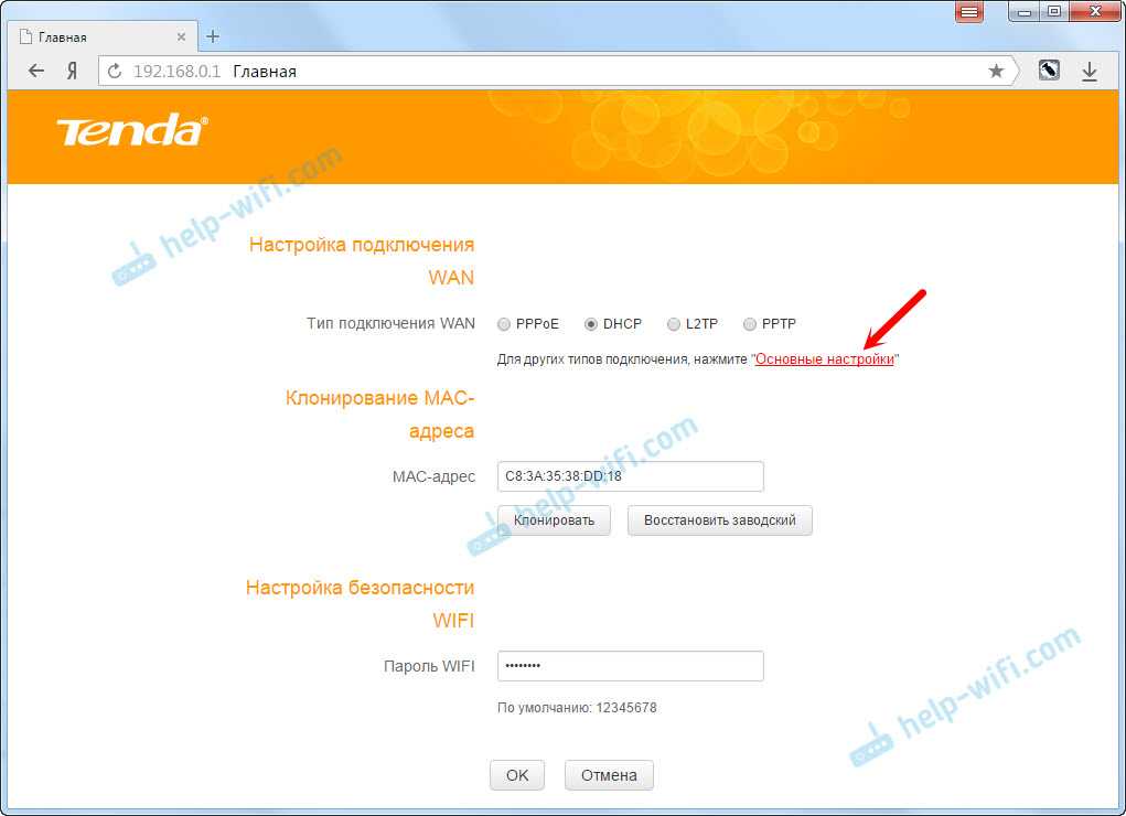Вы увидите страницу с самыми главными настройками. Где нужно указать тип подключения к интернету, задать необходимые параметры, и сменить пароль WiFi сети. Все настройки можно задать на этой странице, если вам так будет удобнее. Я же советую нажать на ссылку «Основные настройки», и открыть расширенные параметры роутера Tenda N301, где мы все настроим.