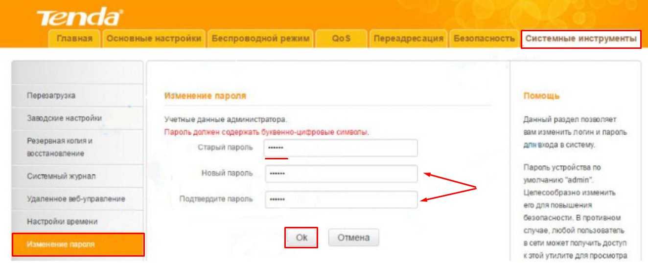 Для смены пароля самого роутера выберите пункт меню «Administration» (еще возможные названия «System tools» или просто «Tools»). Далее найдите пункт «Change password» и введите новый пароль от роутера тенда. В конце нажмите кнопку «ОК».