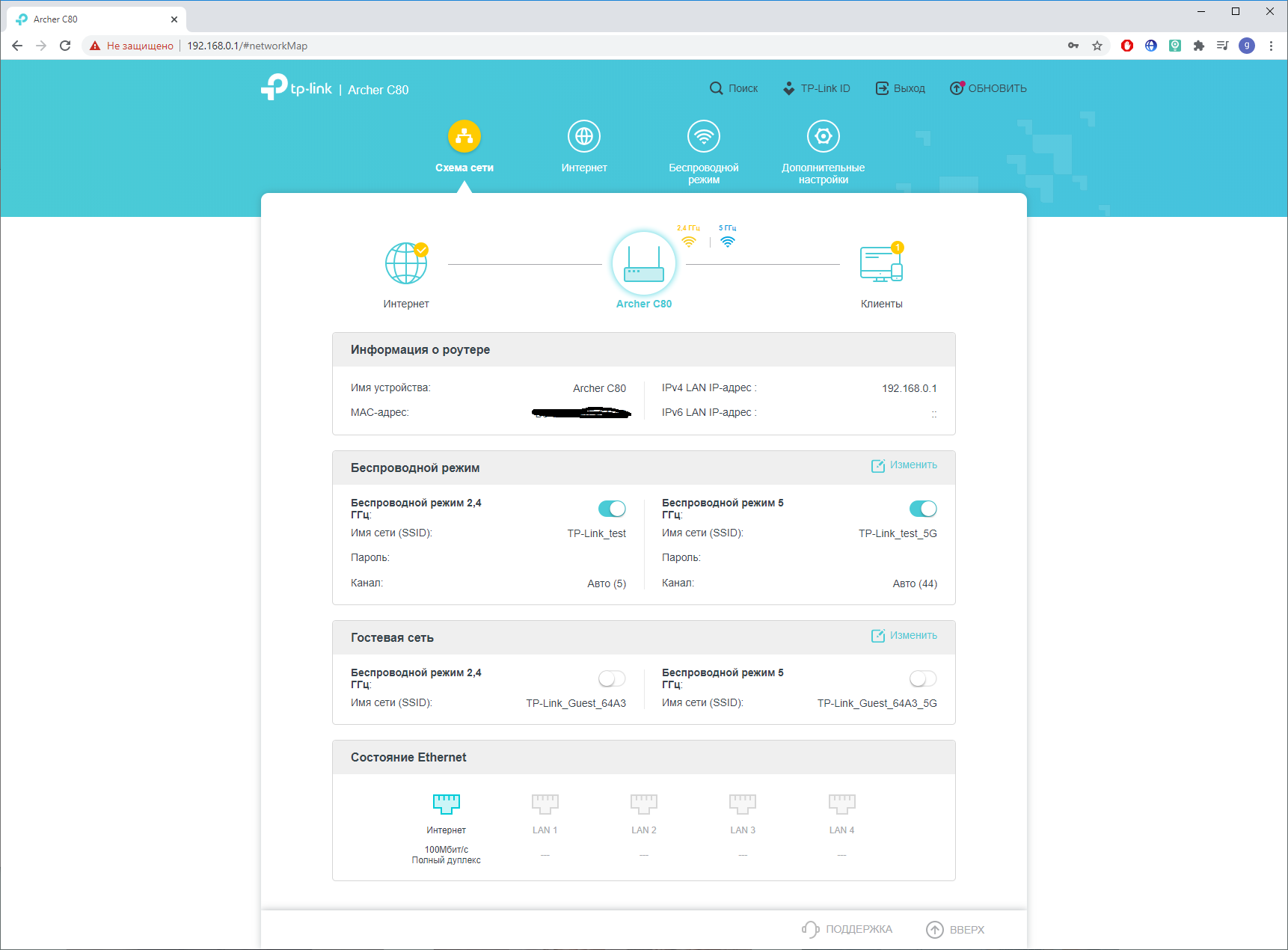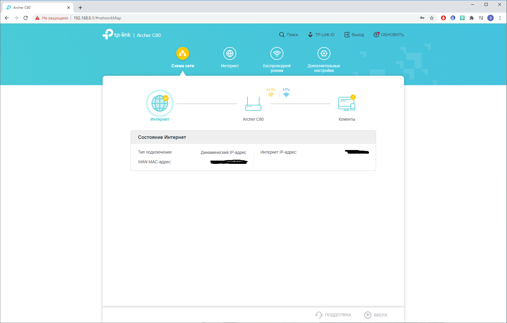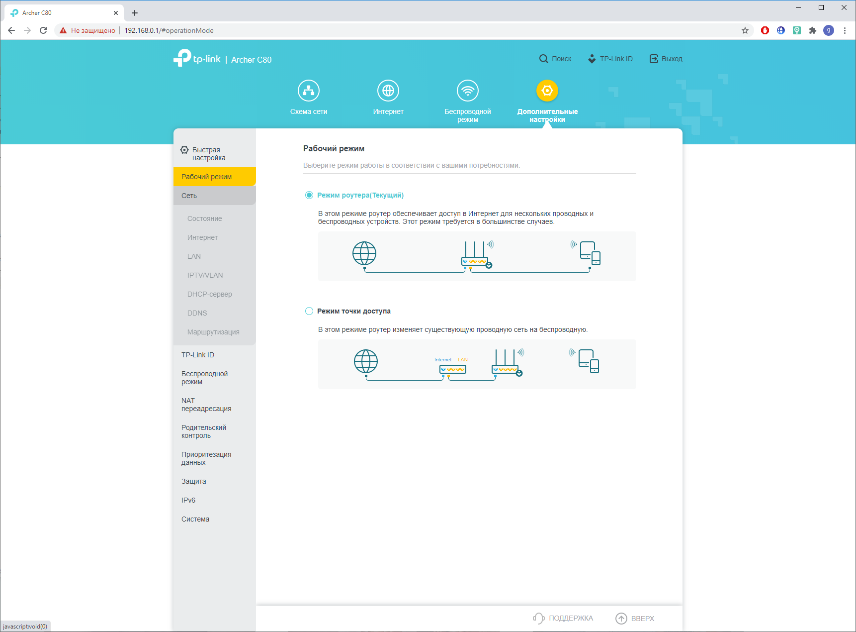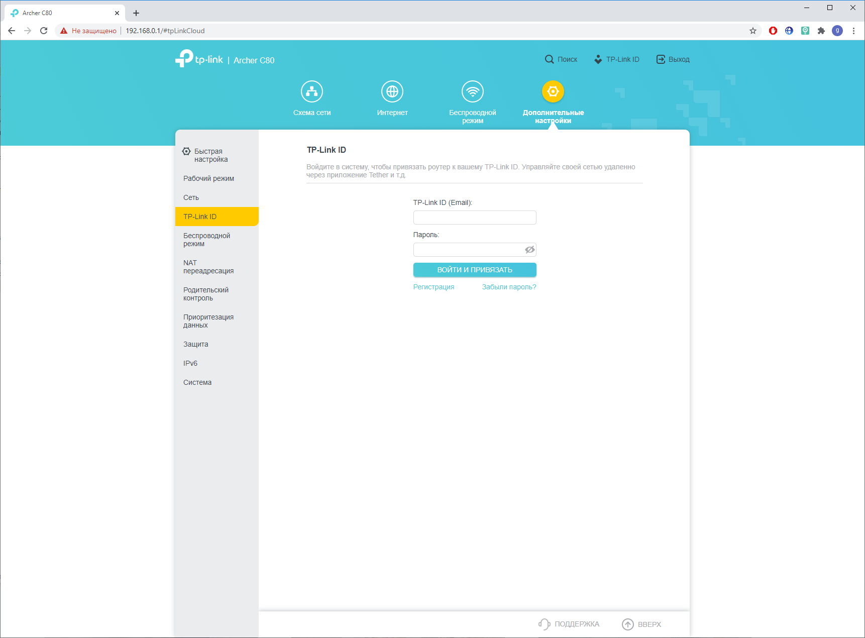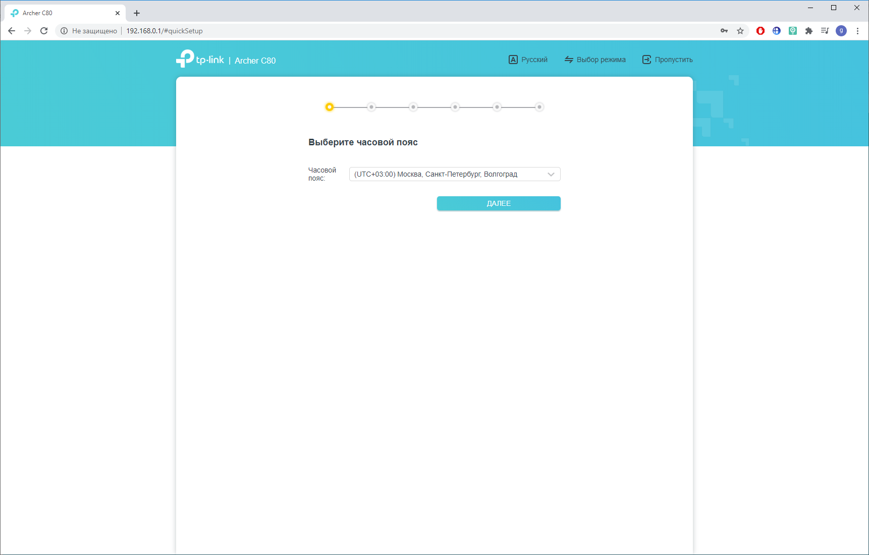 Классический способ подразумевает подключение к TP-Link Archer C80 посредством Web-интерфейса. Последний имеет приятный дизайн со спокойной цветовой гаммой, удобное меню, обилие настроек и поддерживает русский язык. Доступ предоставляется по IP 192.168.0.1 в адресной строке.