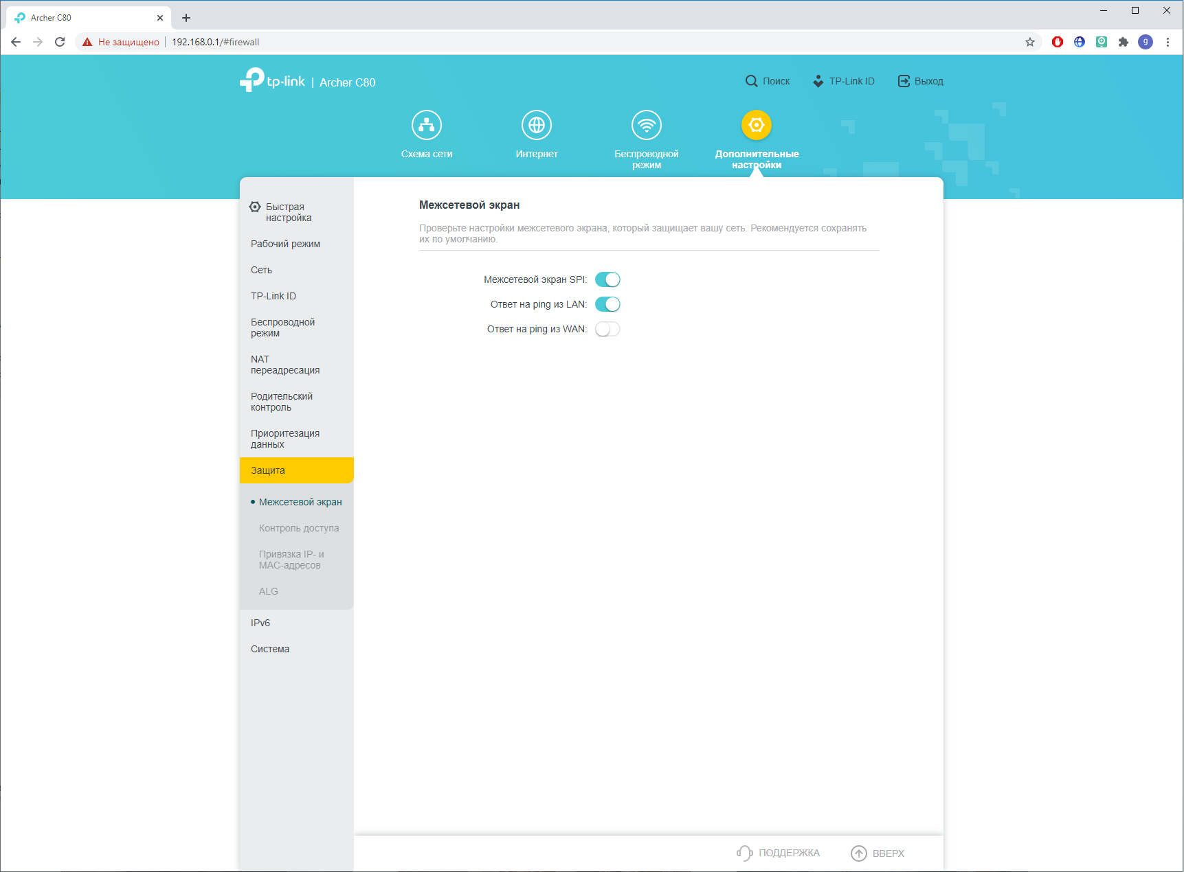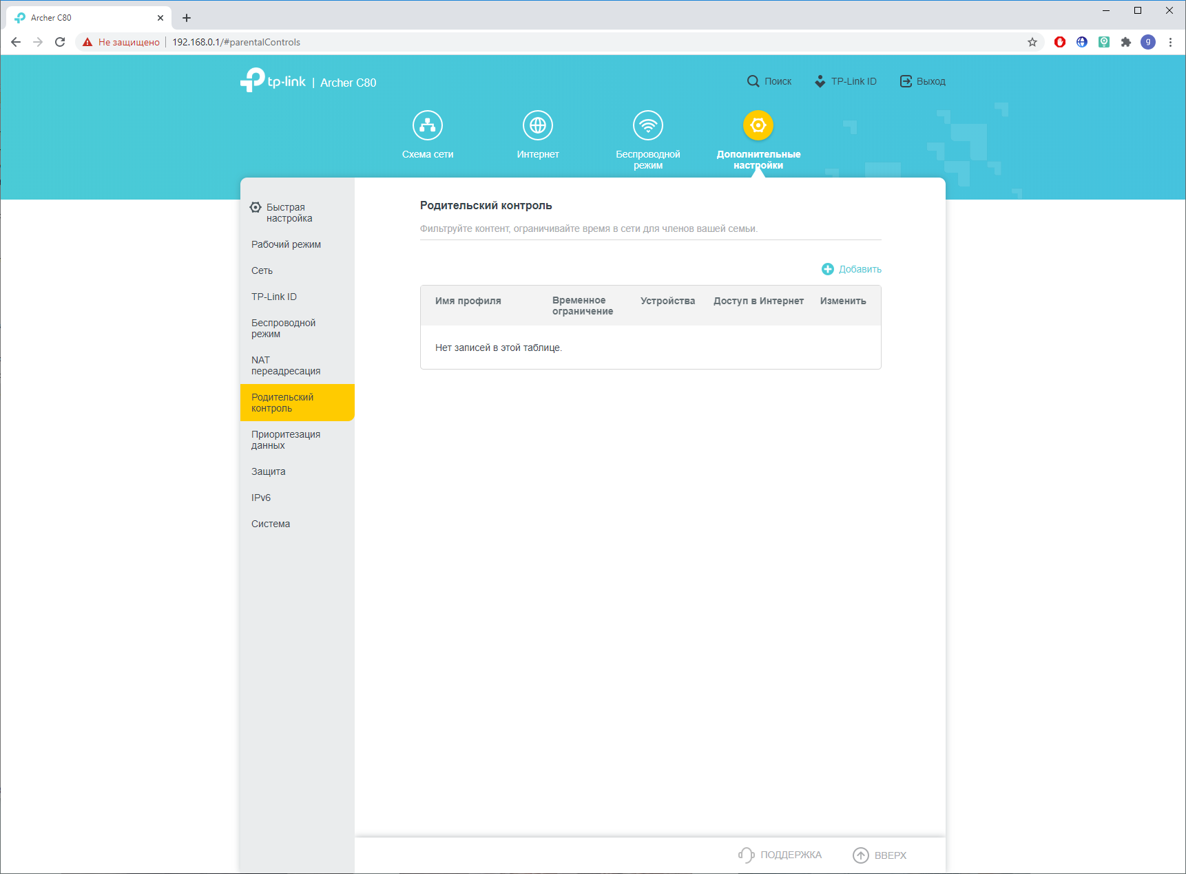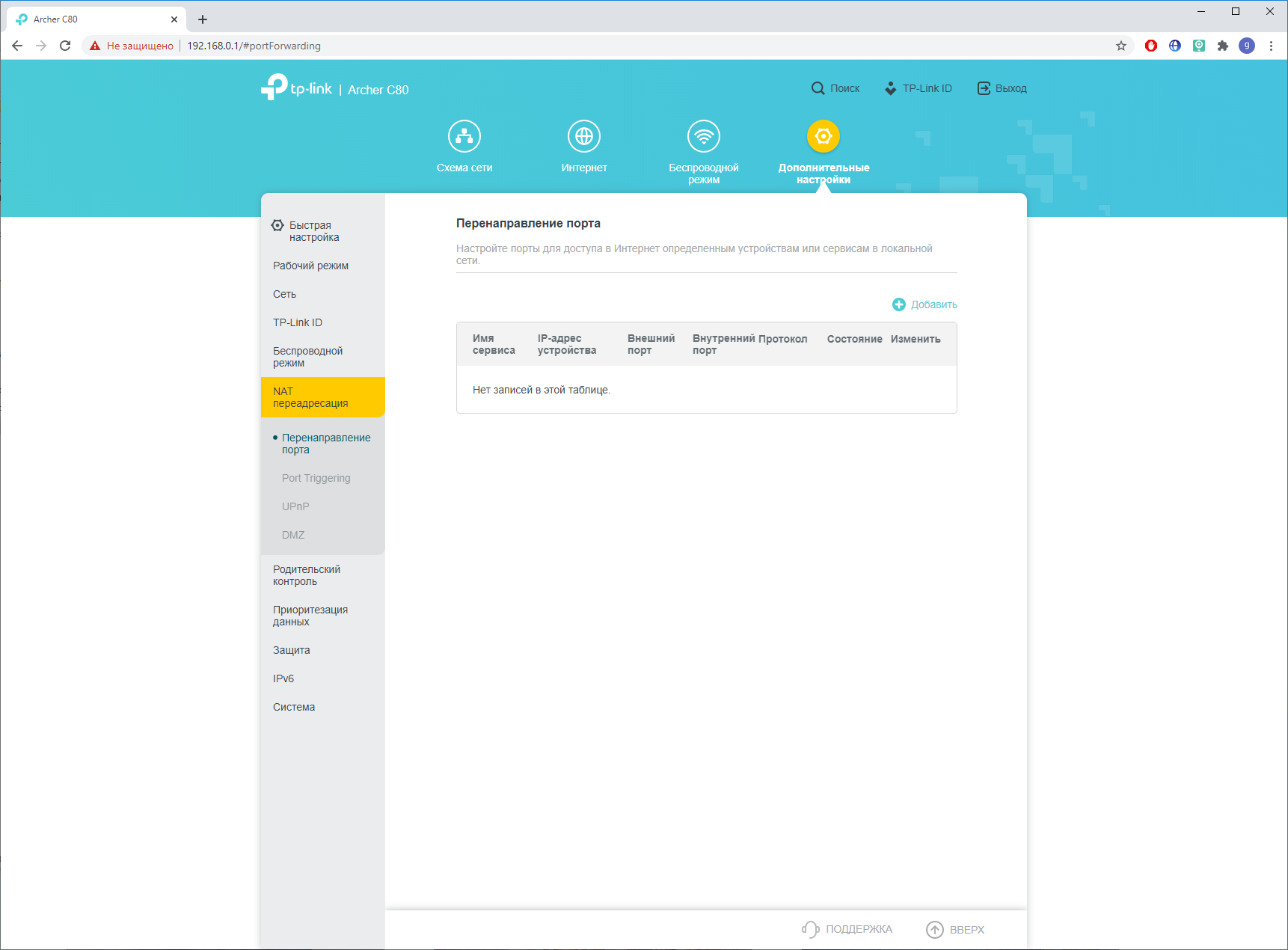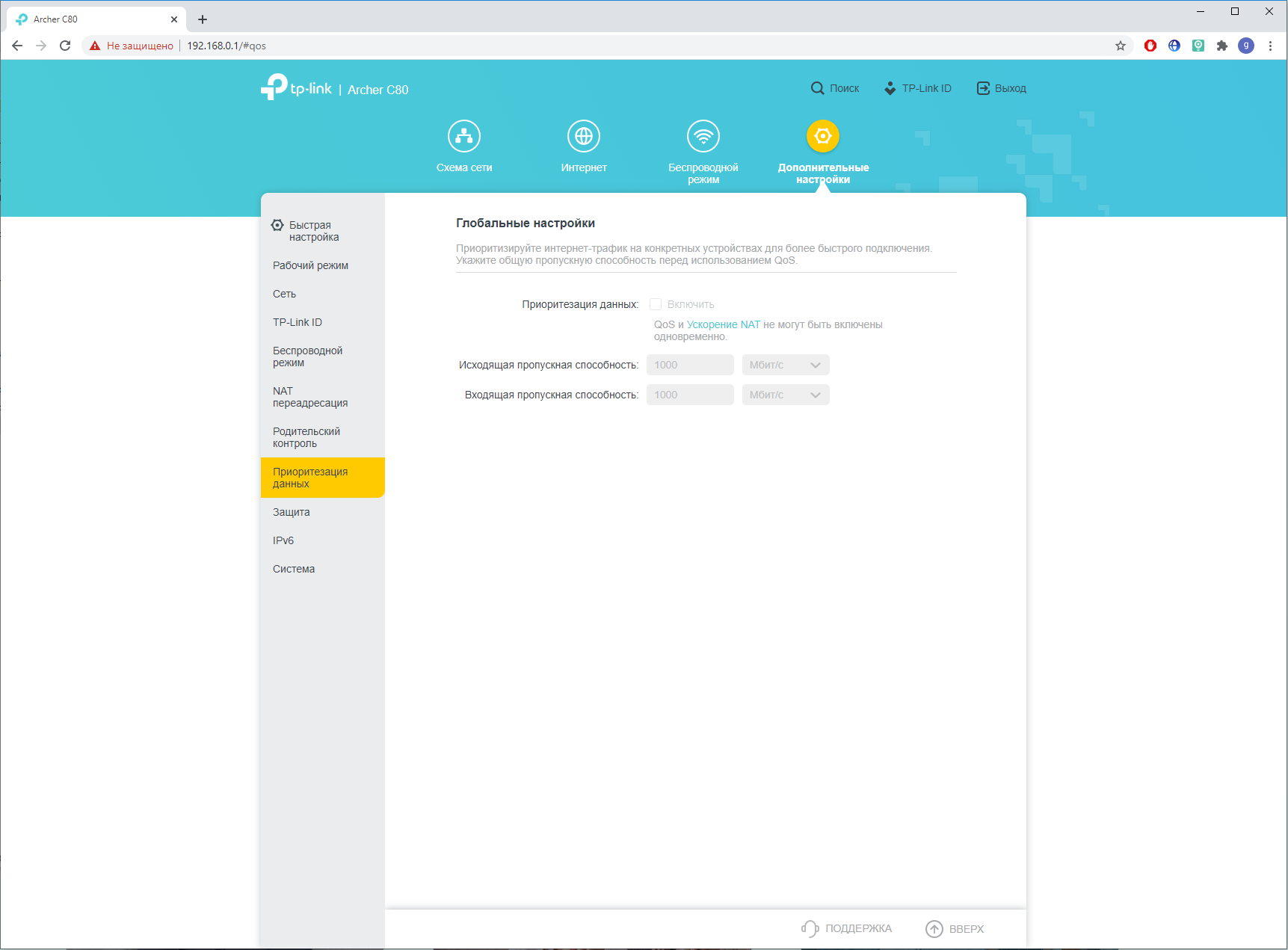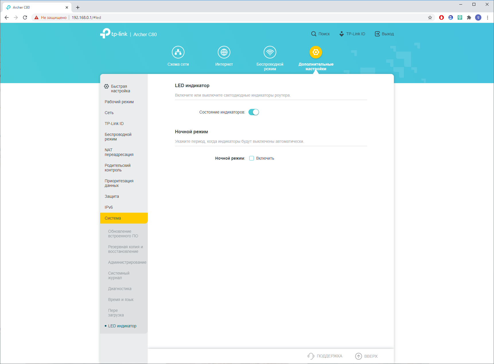 Классический способ подразумевает подключение к TP-Link Archer C80 посредством Web-интерфейса. Последний имеет приятный дизайн со спокойной цветовой гаммой, удобное меню, обилие настроек и поддерживает русский язык. Доступ предоставляется по IP 192.168.0.1 в адресной строке.