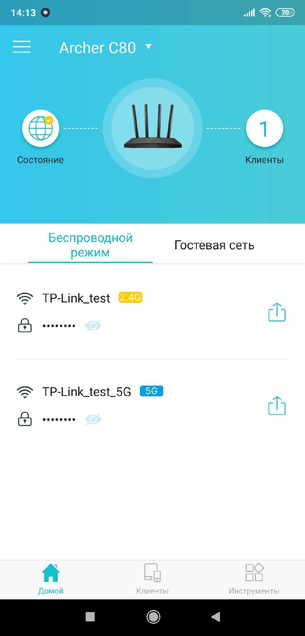 Для управления C2300 вы можете использовать мобильное приложение TP-Link Tether (iOS и Android) или более обширную веб-консоль. Главный экран содержит карту сети и кнопку SpeedTest, которая измеряет скорость загрузки и скачивания через Интернет.