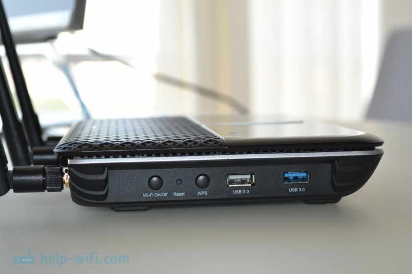 С левой стороны расположены три кнопки: Wi-Fi On/Off (для включения/отключения беспроводной сети), Reset и WPS. И два USB-порта, один из которых стандарта 3.0 (он синий внутри).