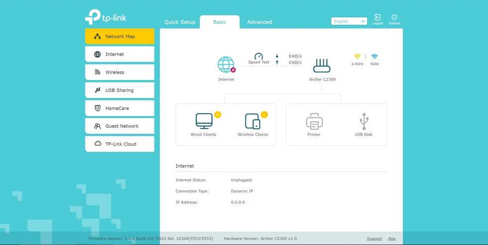 Слева от вас находится меню для настройки Интернета, беспроводной связи, общего USB-подключения и настроек HomeCare. Также имеется вкладка меню для настройки гостевых сетей для каждого диапазона и вкладка для настройки маршрутизатора для работы с облаком TP-Link, который позволяет получить доступ к маршрутизатору и его настройкам из любого места через Интернет.