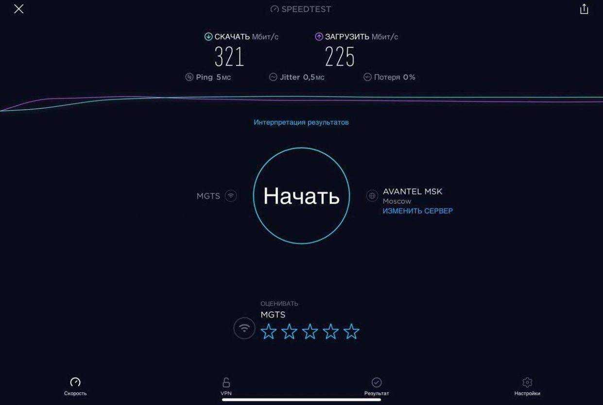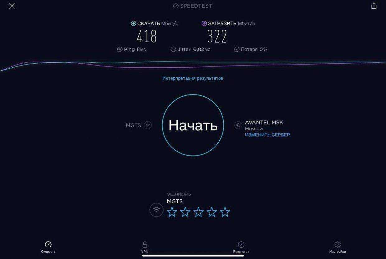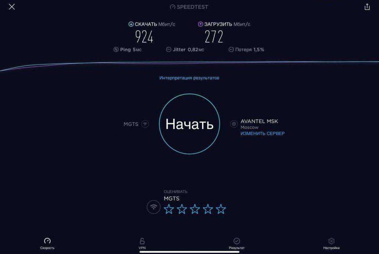 Для проверки работы Mercusys MR50G была проведена серия тестов скорости интернета на iPad Pro для каждого диапазона при подключении проводного интернета скоростью в 1 Гбит/с (G-PON МГТС в дневное время) при минимальном влиянии соседних роутеров.