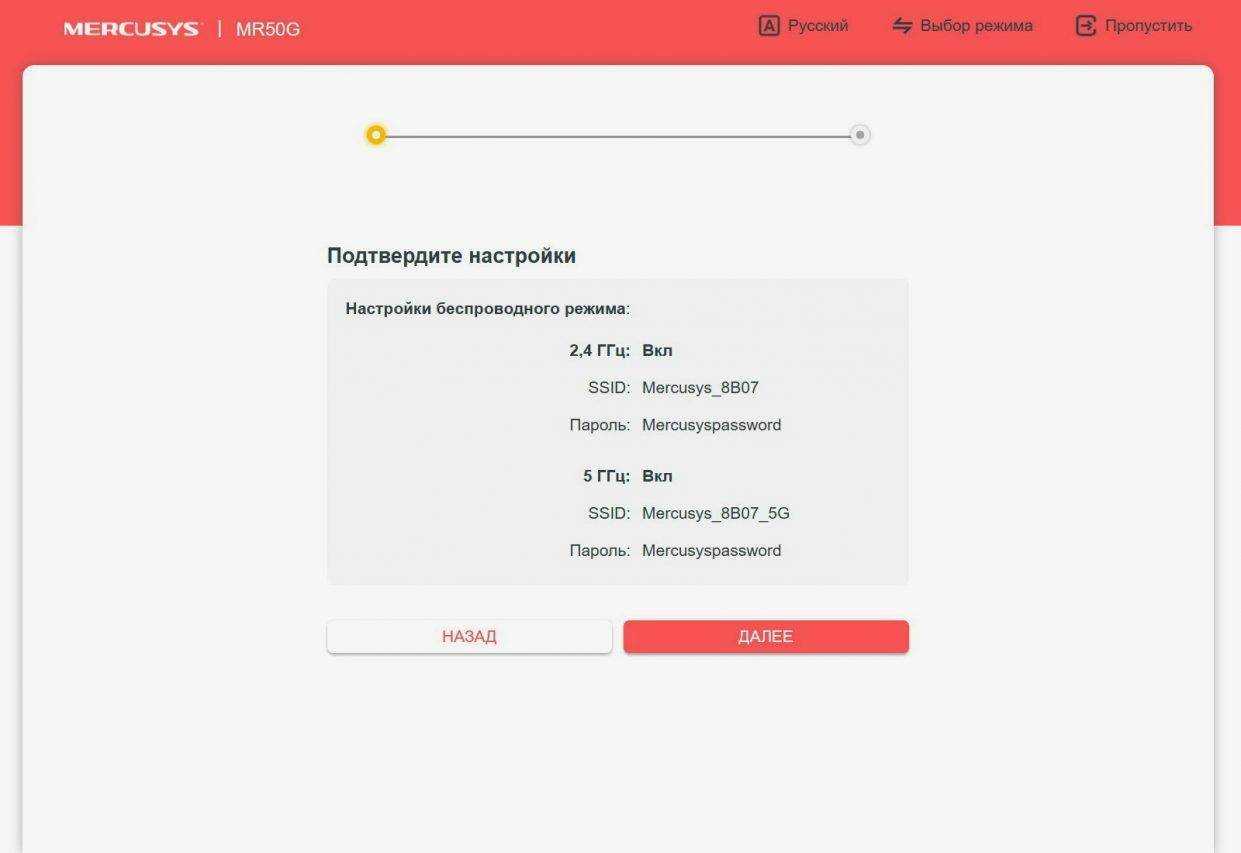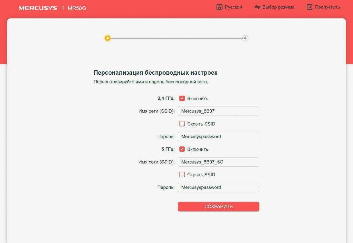 - После успешной проверки подключения к интернету нужно задать имя Wi-Fi сети и установить пароль. Это параметры сети, которую будет создавать Mesh Wi-Fi система Mercusys Halo H50G.