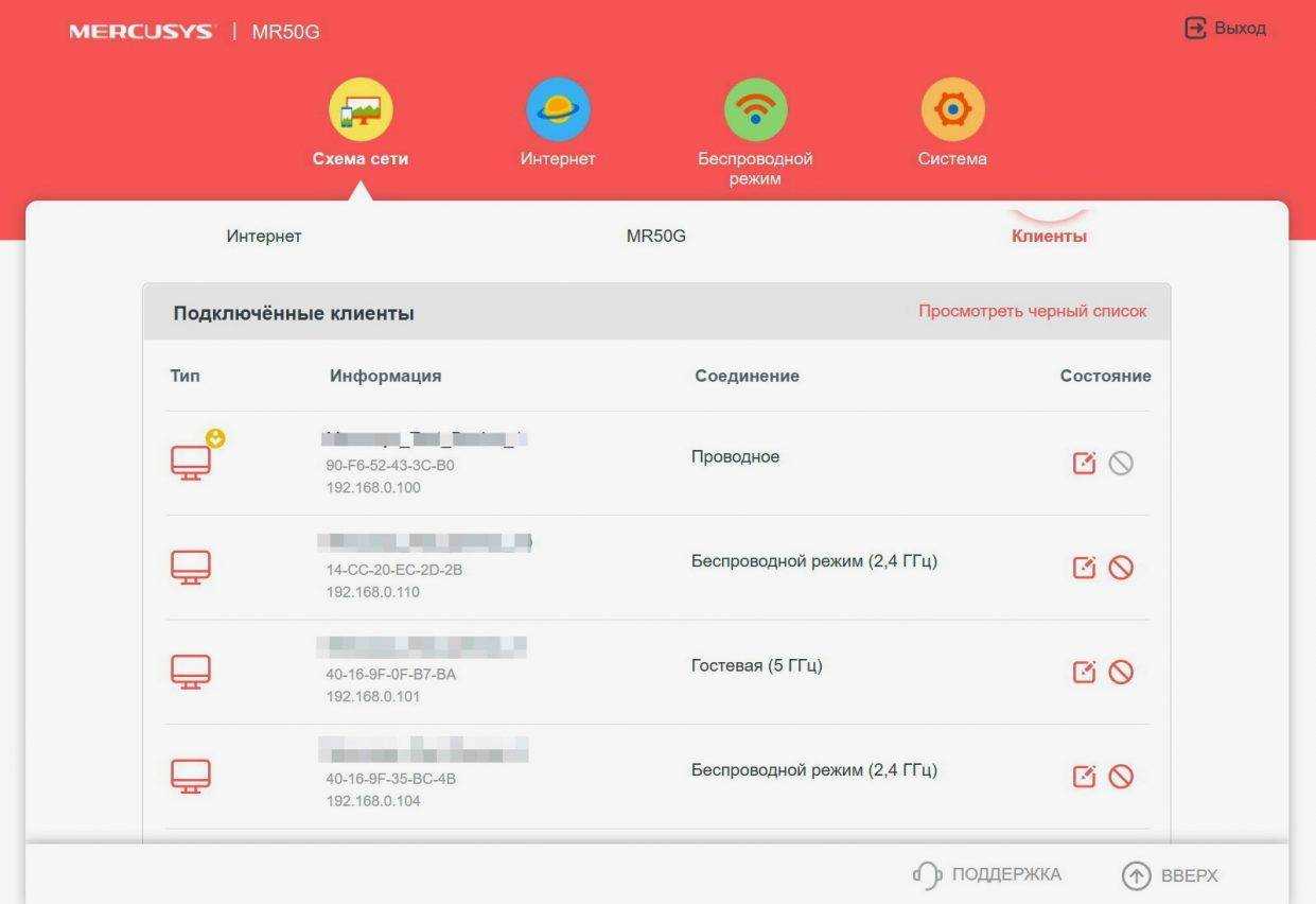 Текущее состояние, параметры и подключенные устройства наглядно показаны на главной вкладке «Схема сети». Конечно, гостевой доступ, черный список и тоже есть.