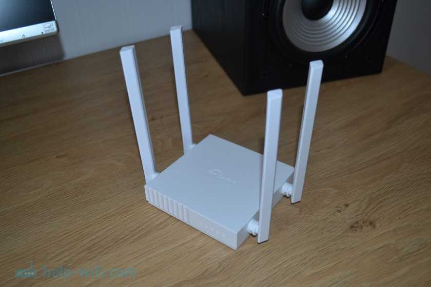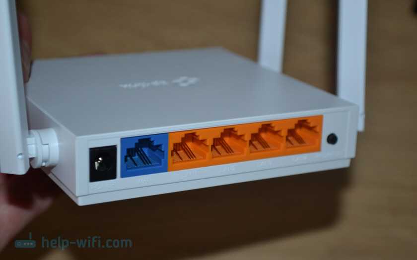 На верхней части — только тисненый логотип TP-Link по центру. По бокам, с левой и правой сторон — по две несъемные антенны. Сзади — разъем питания, выделенный синим цветом разъем WAN, четыре LAN-порта оранжевого цвета и совмещенная кнопка WPS/RESET. По нажатию активируется опция WPS, а удержанием можно сбросить роутер к заводским настройкам. Отдельной кнопки включения — нет.