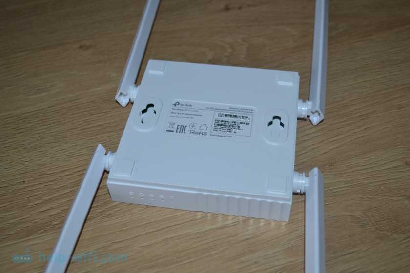 Тыльная сторона имеет четыре пластиковые ножки, два отверстия-крепления для настенного способа установки роутера и стикер со всей служебной информацией. Что интересно, в Archer C24 вообще нет никаких прорезей, отверстий или прочих вырезов для охлаждения внутренних компонентов.