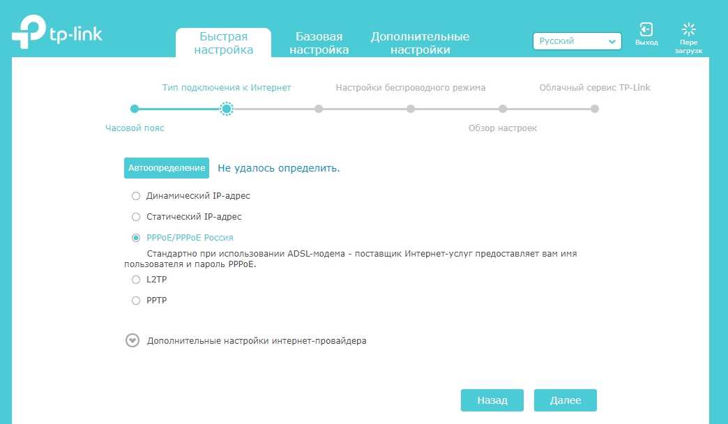 - На этапе настройки интернета нам нужно указать тип подключения, который указан в договоре провайдера.