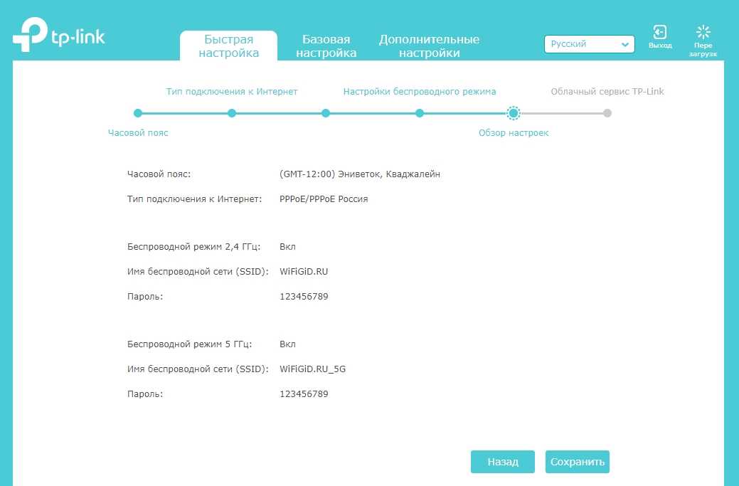 Далее нужно будет придумать пароль, указать часовой пояс и придумать названия для сетей Wi-Fi и пароли для них же. Всё.