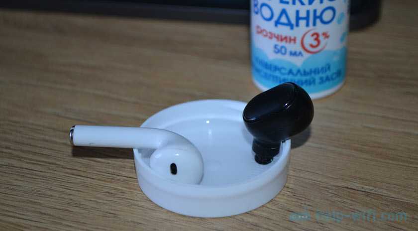 Через 10-15 минут достаем наушник, но не переворачиваем его! Нужно чтобы жидкость вытекла и не попала внутрь наушника на динамик. Немного подержите наушник в таком же положении сеткой вниз. Можно их немного стряхнуть, или постучать. А еще лучше положить на салфетку, чтобы они постояли так минут 10-20. Правда зафиксировать в таком положении их не очень просто, но возможно.