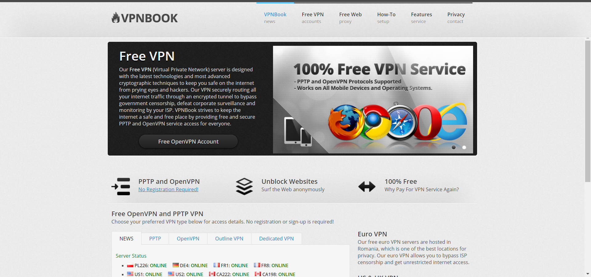 Еще один VPN-инструмент с неограниченным трафиком и 256-битным AES-шифрованием. В отличие от многих бесплатных сервисов, VPNBook позволяет получить доступ к Netflix US, Hulu и HBO GO. Дополнительно можно разблокировать такие ресурсы, как BBC iPlayer и ITV Hub, если подключиться к серверу из Великобритании. Поддержка торрентов, к сожалению, отсутствует.