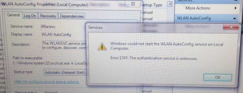 И вместо того, чтобы служба заработала, а вместе с ней и беспроводное подключение на компьютере, появляется ошибка 1747. Жаль, что я не додумался попросить у Алексея скриншот самой ошибки. Но нашел фото в интернете. Правда, на английском языке. Там написано: «Не удалось запустить службу Служба автонастройки WLAN на локальный компьютер. Ошибка 1747: служба аутентификации неизвестна».