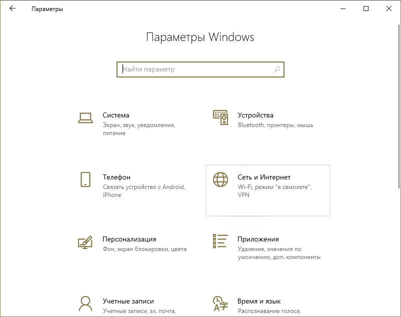 Сначала нужно зайти в настройки ОС. Для этого одновременно нажмите на клавиши Win и I. Далее перейдите в раздел, который отвечает за сеть.