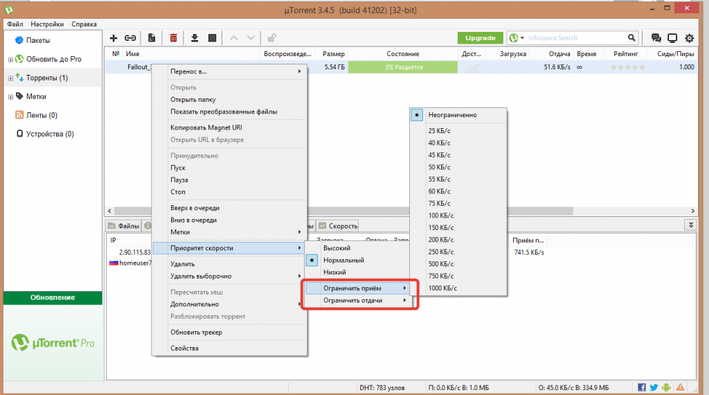 Маленькое соотношение сидов и пиров: если раздающий один, а скачивающих сотня. В первые секунды вы начинаете загрузку не столько от основого сида, сколько от других пиров, которые уже успели загрузить часть данных. Когда процент скачанной информации выравнивается у всех участников – скорость загрузки торрента резко падает, потому что ваш клиент пытается подключиться к главному раздающему. Решение: найдите другой торрент-трекер или подождите пока кто-то из пиров полностью скачает файл и автоматически станет раздающим. Если резко упала скорость торрента для всех загрузок и появляется ошибка Диск перегружен 100%, значит компьютер перестал справляться с потоком входящих данных. Более подробно о решении этой проблемы написано здесь. При достаточном количестве пиров, попробуйте ограничить другие загрузки, выставив на необходимый приоритет. Т.е. искусственно «урезать» скорость передачи и приема для других файлов. Щелкните правой кнопкой мышки на задании и выберите пункт «Приоритет скорости»