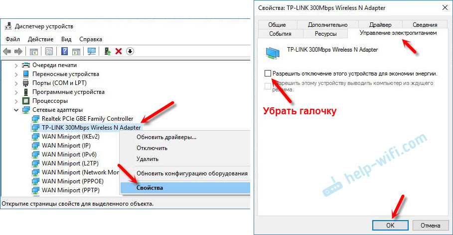 Просто нажмите правой кнопкой мыши на «TP-Link 300Mbps Wireless N Adapter» и выберите свойства. Перейдите на вкладку «Управление электропитанием» и запретите отключения энергии для адаптера.