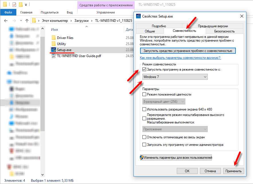 - В разделе «Совместимость» поставьте галочку напротив «Запустить эту программу в режиме совместимости для», в выпадающем списке ниже выберите Windows.