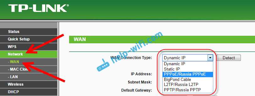 2. Если все подключено правильно, то проверяем настройки. Зайдите на страницу настроек своего роутера (как это сделать, писал выше). Перейдите на вкладку Network — WAN. Выберите в списке нужный тип подключения, и заполните необходимые поля.