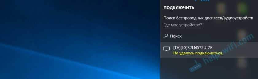 Если телевизор долго не может подключиться, а затем появляется сообщение об ошибке. Либо компьютерная техника не может «увидеть» телевизор и он даже не отображён в списке доступных устройств.