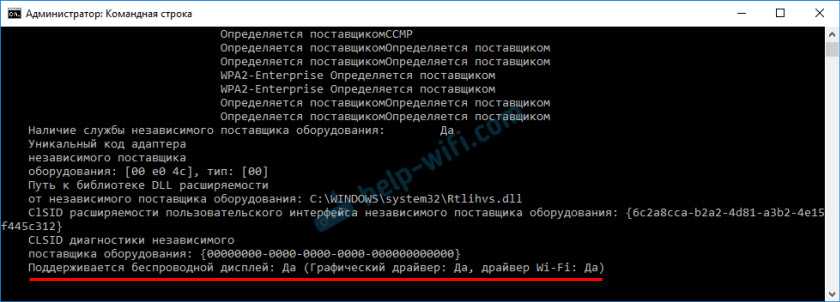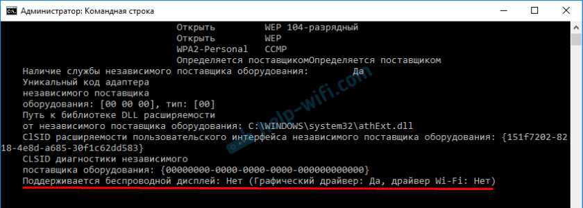 Не все видеокарты и Wi-Fi адаптеры поддерживают функцию Miracast (WiDi). Проверить это очень просто. Запускаем командную строку от имени администратора и выполняем команду netsh wlan show driver.