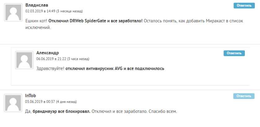 Для предотвращения кражи данных и воздействия на систему вредоносного программного обеспечения, конечно же, в системе имеется встроенный фаервол. Практически все пользователи также устанавливают антивирус. Такое ПО может принимать обычные безвредные программы за потенциальную угрозу, соответственно, блокировать их деятельность. Это может относиться к установке соединения между компьютером и другим устройством посредством Miracast.