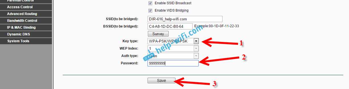 Далее остается только задать те же параметры для wifi, что и у основного роутера — выбрать тип шифрования, SSID и пароль — и сохранить изменения.