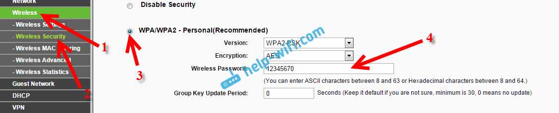 6 Не забудьте поставить пароль на Wi-Fi сеть, которую будет раздавать настроенный нами маршрутизатор. Можете посмотреть подробную инструкцию по защите Wi-Fi на Tp-Link. Там все просто. В настройках, на вкладке Wireless — Wireless Security, выделите пункт WPA/WPA2 — Personal(Recommended), в поле Wireless Password задайте пароль (минимум 8 символов), и нажмите снизу кнопку Save.