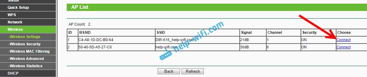 Выберите из списка нужную сеть, с которой роутер будет получать интернет. Напротив нужной сети нажмите на ссылку ‘Connect’.