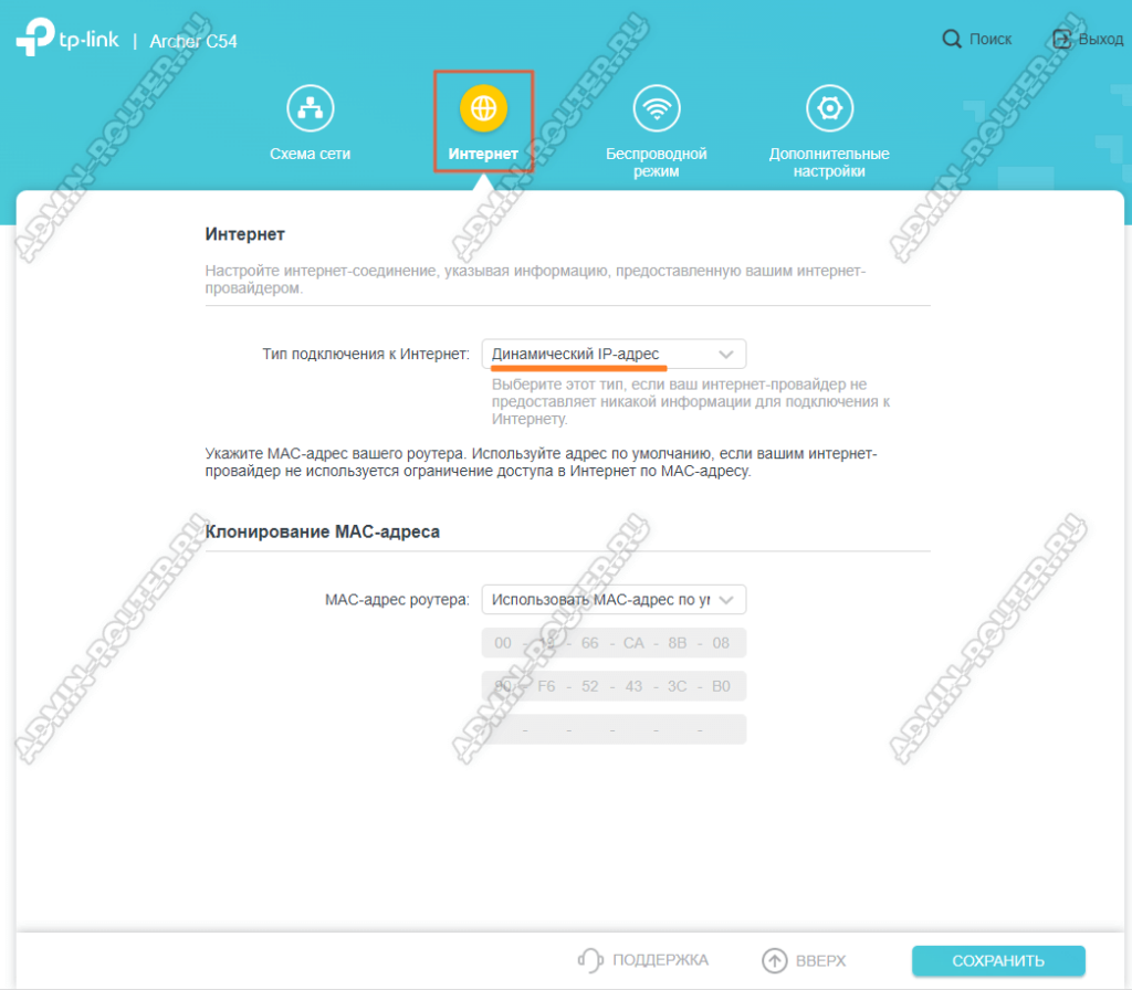 Тут надо будет клонировать MAC-адрес того устройства, которое зарегистрировано у провайдера. Например, если Вы поменяли роутер на новый и не клонировали аппаратный адрес старого, то доступа в Интернет не будет и у клиентских устройств будет выдаваться сообщение на экране: «Сеть без доступа к Интернету».