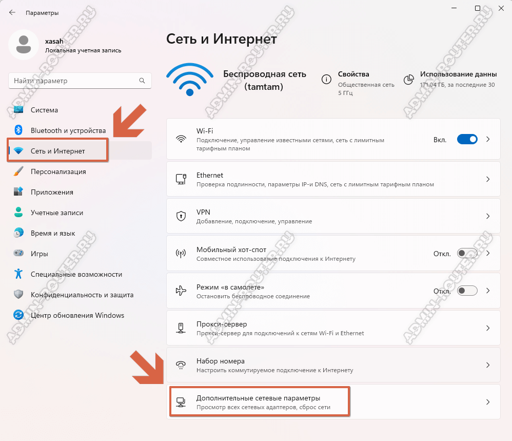 В Windows 11 надо зайти в параметры системы и открыть раздел «Сеть и Интернет» ⇒ «Дополнительные сетевые параметры»: