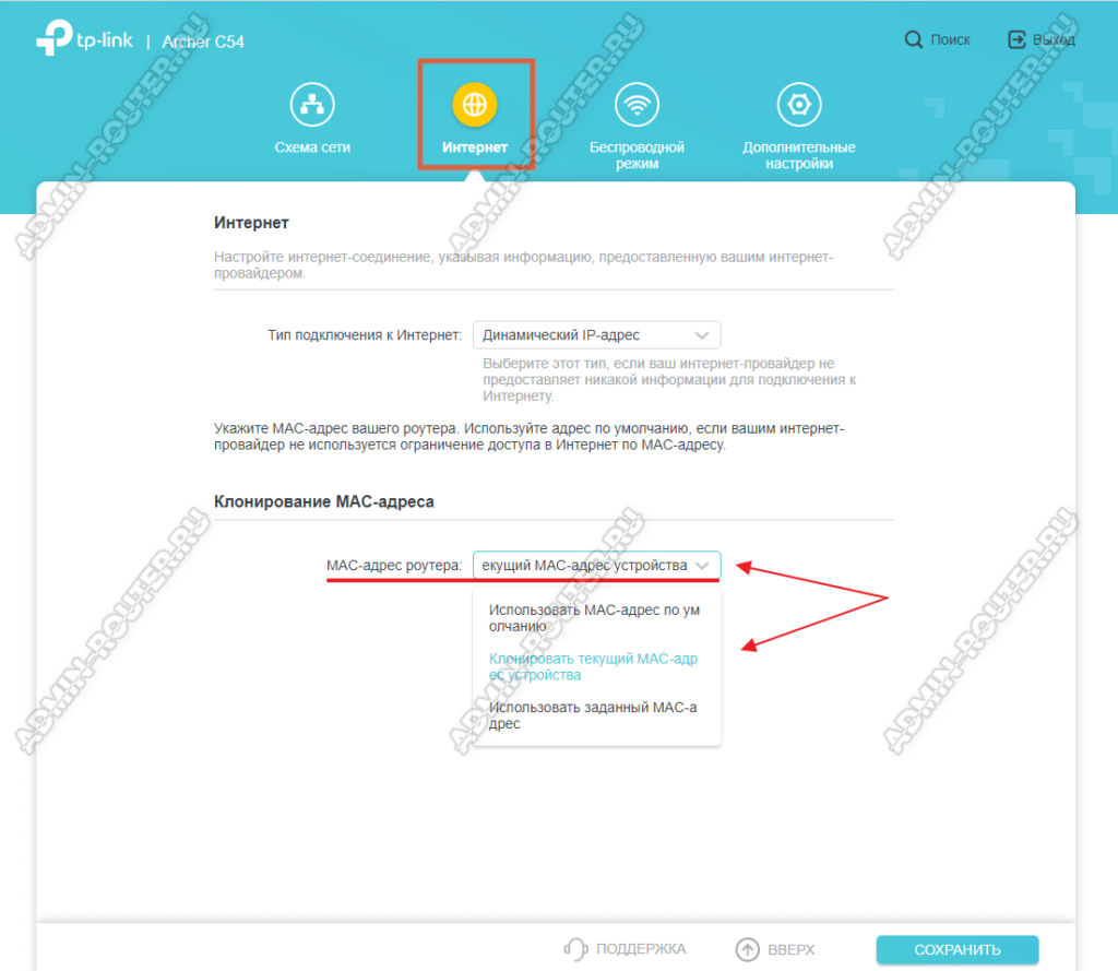 Тогда надо обратить внимание на раздел «Клонирование MAC-адреса»: