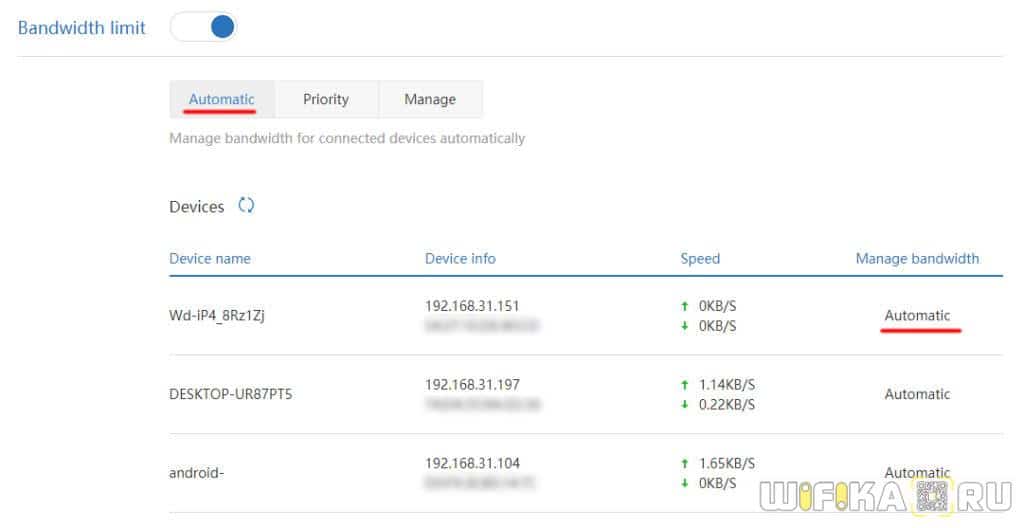 После чего мы увидим список подключенных к роутеру Xiaomi устройств. По умолчанию регулировка находится в автоматическом режиме, то есть маршрутизатор сам определяет, кому в данный момент скорость интернета важнее.
