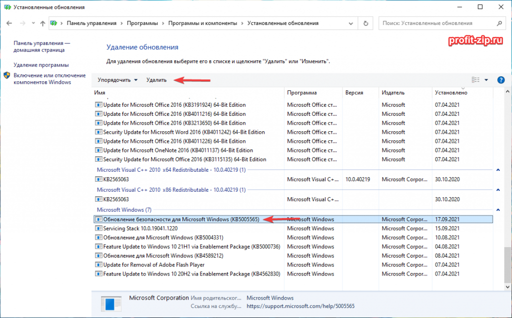 В открывшемся окне найдите обновление с индексами из перечисленных выше, выделите их и нажмите «Удалить» в панели сверху. Согласитесь на удаление обновления и дождитесь завершения удаления.
