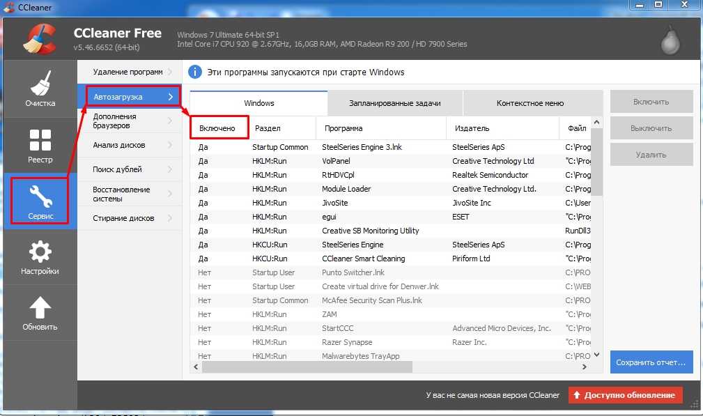 - А теперь самое главное – убрать всё лишнее из автозагрузки. Переходим в «Сервис» – «Автозагрузка» – устанавливаем сортировку так, чтобы вы видели, какие программы включены. Выключите все подозрительное и перезапустите машину.