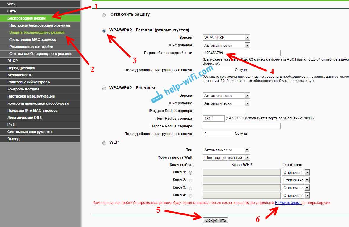 Здесь нужно выделить пункт WPA/WPA2 — Personal (рекомендуется), выставить остальные параметры как у меня на скриншоте ниже, и в поле Пароль беспроводной сети придумать и записать пароль, которым будет защищен ваш Wi-Fi. Пароль должен быть минимум из 8 символов. Нажмите на кнопку Сохранить, и можете сразу нажать на ссылку «Нажмите здесь», что бы перезагрузить роутер.
