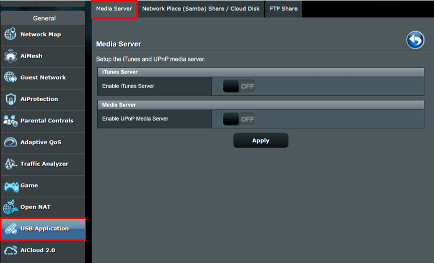 В новой версии панели администратора Asus настройка FTP сервера и прочих функций, выполняемые USB портом, сгруппированы в разделе «USB-приложение».
