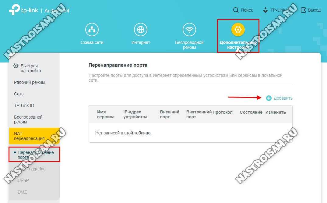 Для некоторых онлайн-игр и и программ иногда требуется сделать проброс виртуального TCP или UDP порта. Чтобы открыть порт на роутере ТП-линк Арчер С6, Вам надо зайти в раздел «Дополнительные настройки» ⇒ «NAT переадресация» ⇒ «Виртуальные серверы» и нажать на кнопку «Добавить»: