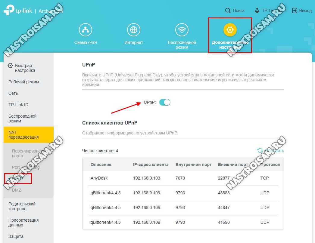 Для активного режима файлообменных программ, игр а так же видеорегистратора системы наблюдения часто требуется настроить проброс портов на роутере. В случае с программами и играми успешно справляется функция UPnP, которая по умолчанию включена на роутере: