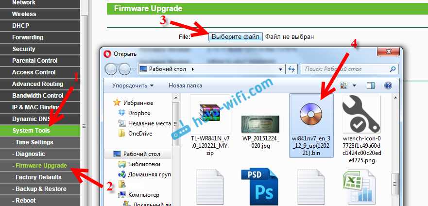 В настройках переходим на вкладку System Tools — Firmware Upgrade. Нажимаем на кнопку Выберите файл, и выбираем в проводнике файл прошивки, который мы скачали.