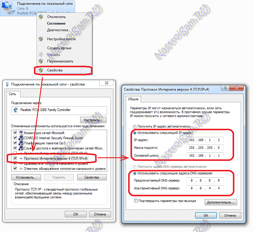 Нажимаем кнопку ОК, закрываем окно и проверяем доступ в сеть. После этих действий доступ в Интернет должен появится. Если этого не произошло — скорее всего проблемы с настройками Вашего роутера, либо дальше, уже на оборудовании провайдера.Примечание: Если у Вас роутер D-Link с IP-адресом 192.168.0.1, то IP-адрес так же надо прописывать из этой же подсети, например — 192.168.0.2.