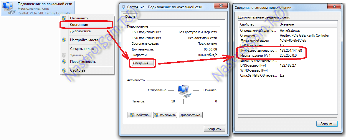 В открывшемся окне состояния подключения нажимаем кнопку «Сведения». В Сведениях о сетевом подключении смотрим поле «IP-адрес (Адрес IPv4)». Если там указан адрес из подсети 169.254.Х.Х — это значит, что система не смогла получить IP-адрес автоматически с помощью DHCP-сервера роутера. Причиной чаще всего служит сбой в работе роутера либо неправильная группировка портов. Что же теперь делать?