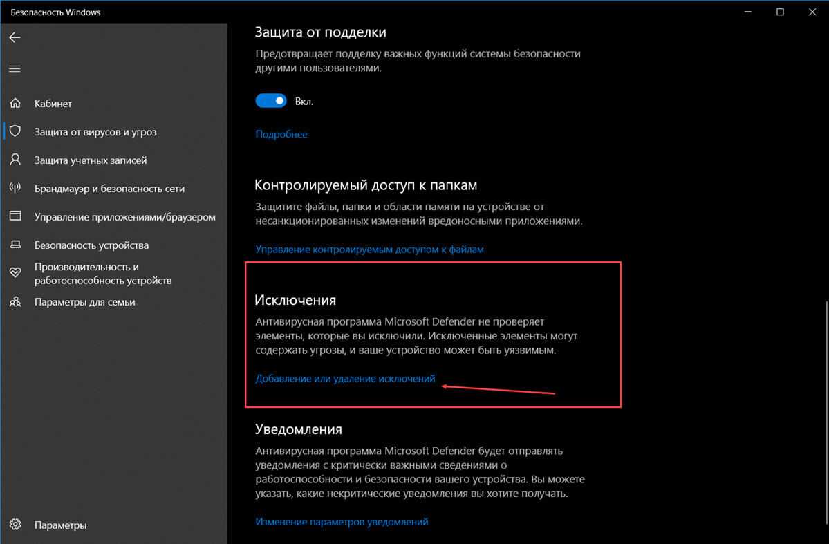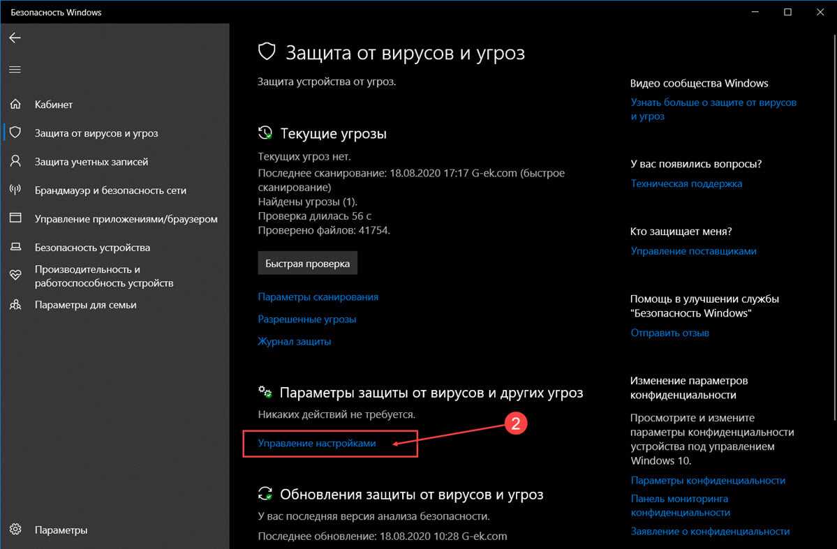 Шаг 1: Чтобы отключить «Защиту в реальном времени» перейдите в раздел «Защита от вирусов и угроз» → «Параметры защиты от вирусов и других угроз» и нажмите ссылку «Управление настройками».