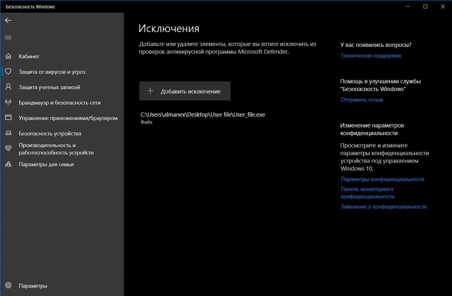 Шаг 4: Нажмите кнопку «Добавить исключение» и выберите нужное, в нашем случае «Файл» и укажите путь к файлу, который вы хотите добавить в исключение антивируса.