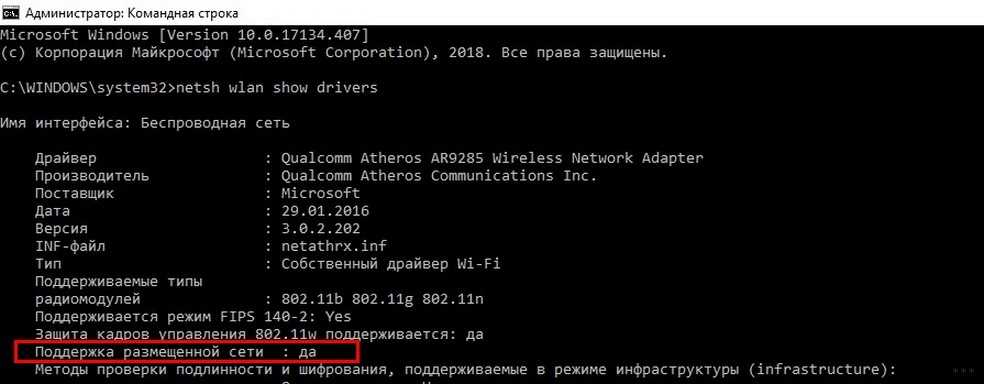 Если написано «Поддержка размещенной сети : да», продолжайте. Иначе ваш шанс только в обновлении драйвера сетевой карты (она может не поддерживать эту функцию вообще).