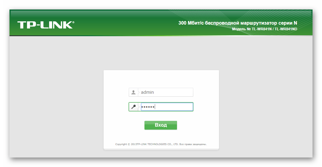 В результате откроется пользовательский интерфейс, в котором необходимо авторизоваться. На данном этапе нужно в полях «Имя пользователя» и «пароль» ввести стандартную раскладку «admin». В конце кликаем по кнопке входа. В результате мы попадем в интерфейс, где собственно и производится настройка TP-Link WR841ND