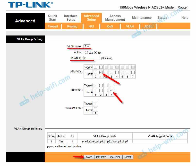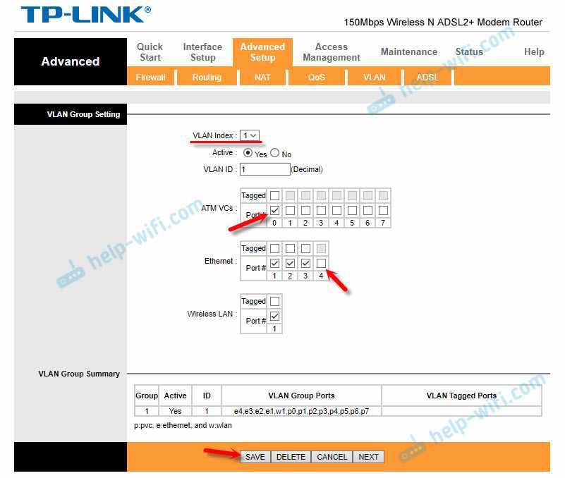 Выберите ‘Vlan Index’: 1. Выставляем порты, как на скриншоте ниже. Три порта LAN и Wi-Fi для интернета. Один порт LAN оставляем для IPTV. Сохраните настройки.