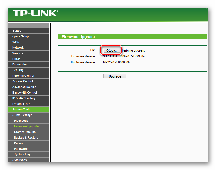 Так же можно перепрошить маршрутизатор вручную. Этот вариант так же подходит, если надо откатить прошивку роутера. Нажмите на кнопку «Обзор»: