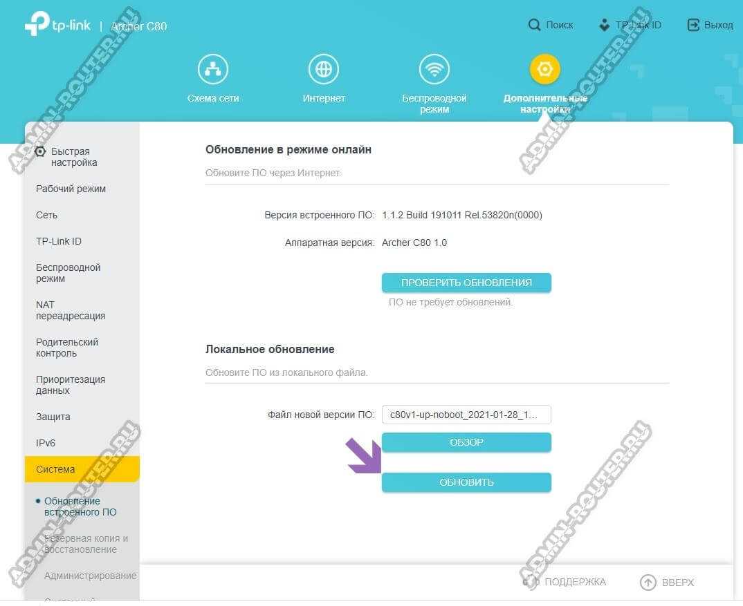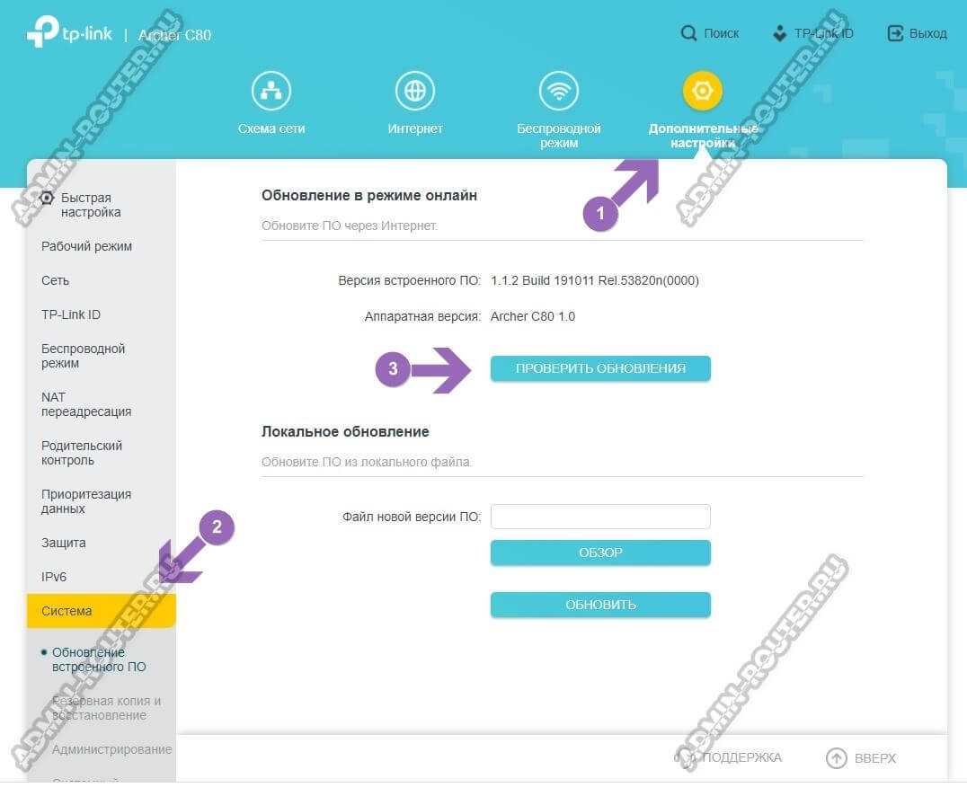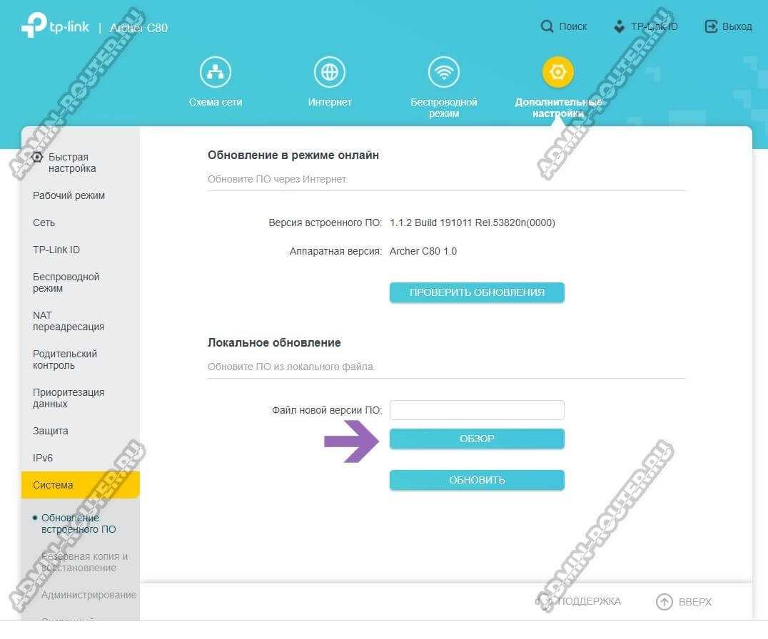 Открываем веб-интерфейс маршрутизатора ТП-Линк и переходим в Дополнительные настройки, где нужно открыть раздел «Система» ⇒ «Обновление встроенного ПО»: