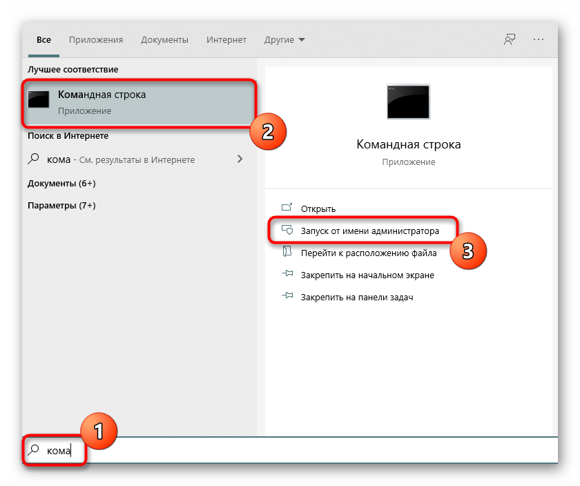 - Сначала откройте «Пуск», отыщите там приложение «Командная строка», воспользовавшись поиском, и справа нажмите по пункту «Запуск от имени администратора».