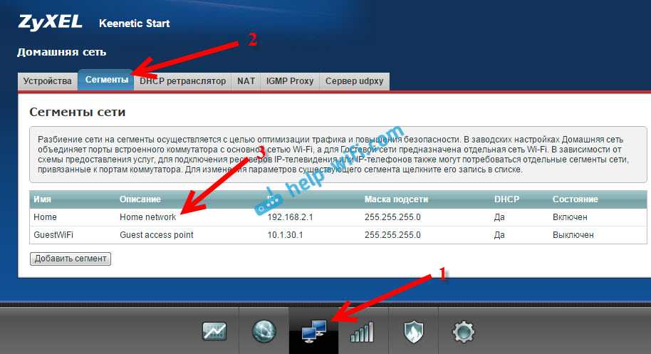 В панели управления перейдите на вкладку Домашняя сеть (снизу) , и сверху откройте вкладку Сегменты. Выберите Home network.